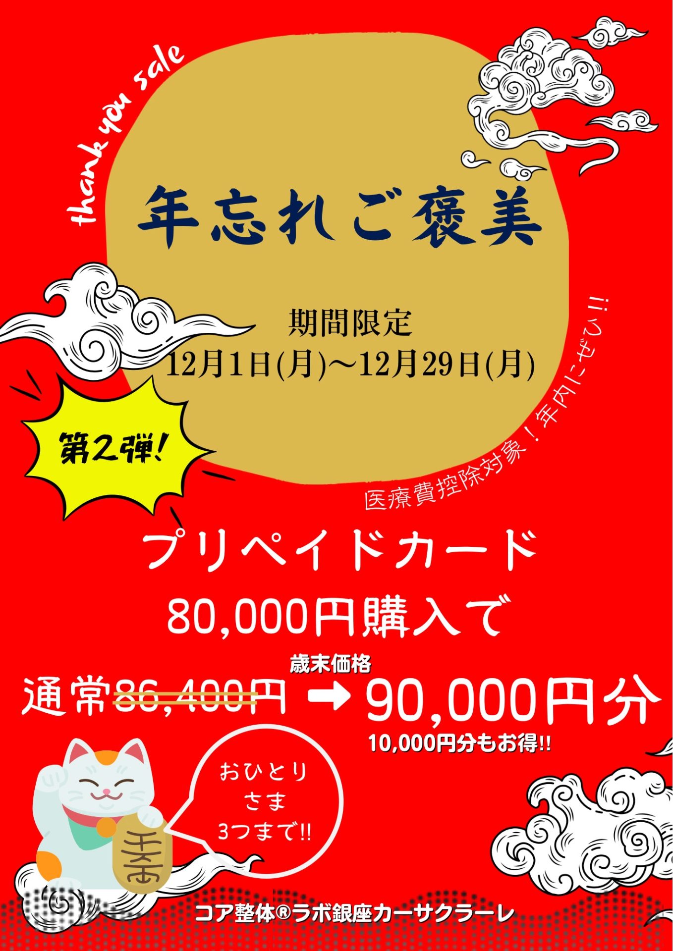 #コア整体ラボ銀座カーサクラーレ #コア整体 #銀座整体 #プリペイドカード #医療費控除 #節税対策 #年末キャンペーン #年末のご褒美 #自分へのご褒美 #年末メンテナンス #疲れ大掃除 #賢いお買い物 #美容整体 #疲労回復 #姿勢改善 #肩こり改善 #腰痛改善 #全身メンテ #マタニティ整体 #産後骨盤ケア #妊婦さんの整体 #産後リカバリー #ワーママ整体 #40代女性のお悩み #50代女性美容 #キャリア女性の味方 #体質回帰 #むくみ改善 #自律神経ケア #ご褒美サロン#健康維持 #足つぼ #ヘッドマッサージ #フェイスマッサージ #美容鍼